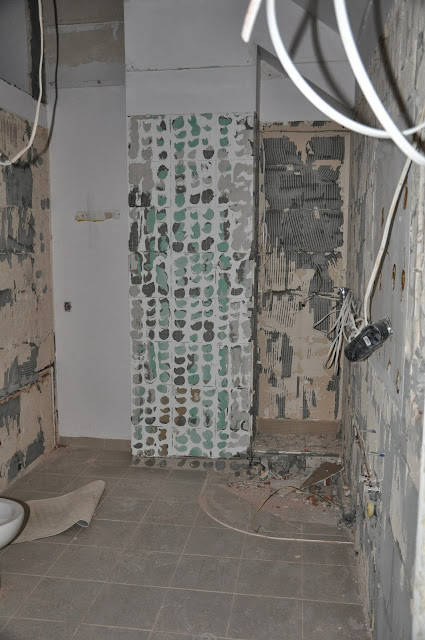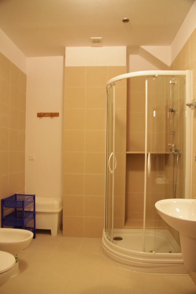 Była ogromna, ale powierzchnia została zupełnie zmarnowana. Na końcu widzicie kabinę. Po lewej stronie od wejścia była pralka, sedes i bidet. Drzwi otwierały się do środka więc zajmowały dużą część ściany. Kolor ścian i kafelki też pozostawiały wiele do życzenia. Drzwi wejściowe również.